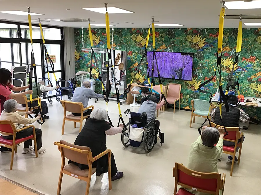 TRX(サスペンショントレーニング)やシニアヨガ、ボール体操、チューブ体操、ペットボトル体操、タオル体操、棒体操などで普段使わない筋肉を刺激し、運動習慣を身につけることで身体機能の低下を予防します。
